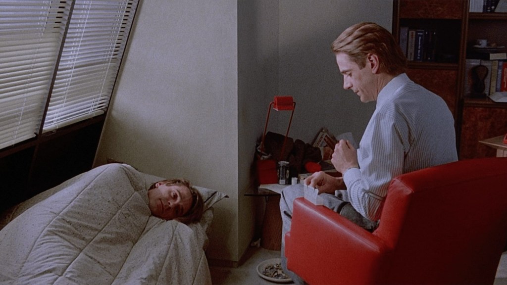 Though Cronenberg sets up Beverly and Claire as the relationship we’re meant to root for on the surface, it’s clear by the end of the film that there’s no way the twins can live separate lives. Beverly seems to be the weaker twin, but Elliot is equally bound up in his love for his brother, enabling him and slowly trying to “sync up” with him in an attempt to reconnect. Any chance Beverly might have had for happiness with Claire becomes impossible. He tries to reach out to her one last time, but changes his mind and returns to his loving brother to die together.