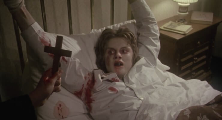 Devil’s Exorcist’s narrative is closely modelled on that of The Exorcist, with one key difference: Darnell’s film features neither an exorcism nor an exorcist. In fact, though Sheila is clearly suffering from demonic possession, the notion of possession is not mentioned at all, and unlike many Eurocult films about possession Devil’s Exorcist also features no role for a priest. Despite this, the film presents the possessed Sheila’s behaviour in ways that mimic the behaviour of Regan in Friedkin’s film: taking to writhing and groaning in her bed, she becomes disruptive and antagonistic towards her parents, but here she escalates to murder (of a child, a dog, and her own mother). With no role for a priest, no explanation is given for the origins or motivations of whatever is possessing Sheila. Nevertheless, at the end of the film this entity passes on to the medical professional (Greene) who has tried to help the child throughout the narrative—much as in the final scene of The Exorcist, the demon Pazuzu transfers from Regan into the body of Father Karras.