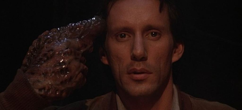 In David Cronenberg’s Videodrome (1983), mass media poses as a liberating escape, offering experiences beyond the everyday. Nikki Brand (Deborah Harry) suggests that “We always want more, whether it’s tactile, emotional or sexual,” and the media meets that need. But in Cronenberg’s vision, as much as a liberatory factor it operates as a controlling force, infiltrating and altering the mind and body through insidious means. Max Renn (James Woods), a television executive obsessed with sensational content, becomes the unwitting subject of “Videodrome,” a broadcast signal that induces hallucinations and physical mutations. The result: his torso splits open vaginally, transforming into a videotape port – a visceral metaphor for media’s invasive power – and his reality gradually becomes a total “video hallucination.”