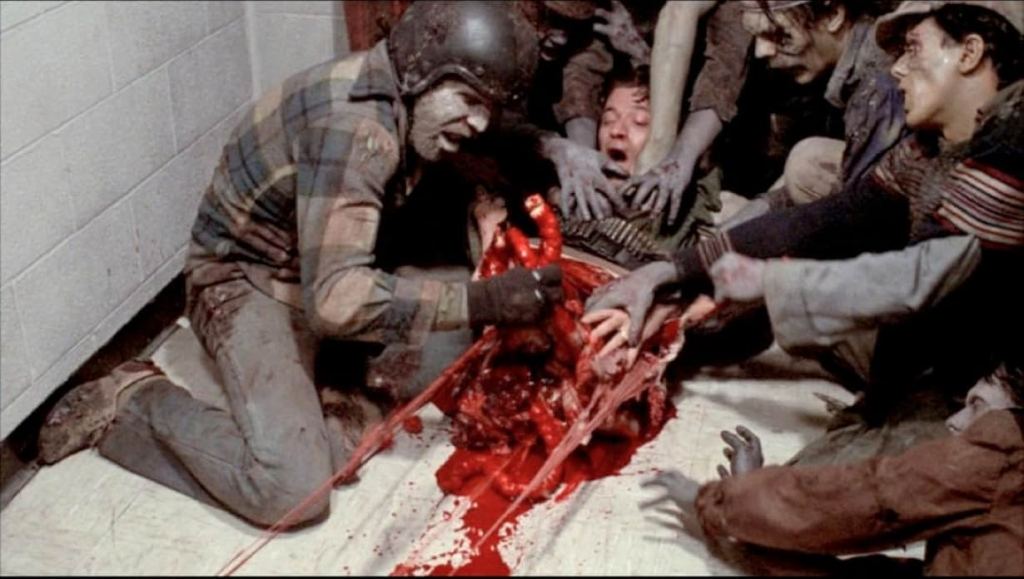In regards to the film’s splatter effects, Romero accepted a halving of his budget, to £3.5 million, in order to obtain an R rating in his attempt to create the most brutal gore possible for television. Special effects legend, Tom Savini, returned to cook up some of the most literally gut wrenching effects ever seen. The demise of Captain Rhodes saw undead extras vomiting, and Pilato himself required his nostrils to be blocked and only managed one take of his characters disembowelling. The pig intestines, used to great effect, were in fact rotting, due to the onset refrigerator having broken the night before filming. Make up was added to by a young Greg Nicotero, who’s career would go on to include work on The Walking Dead (2010-2022), Sin City (2005) and Fallout (2024).