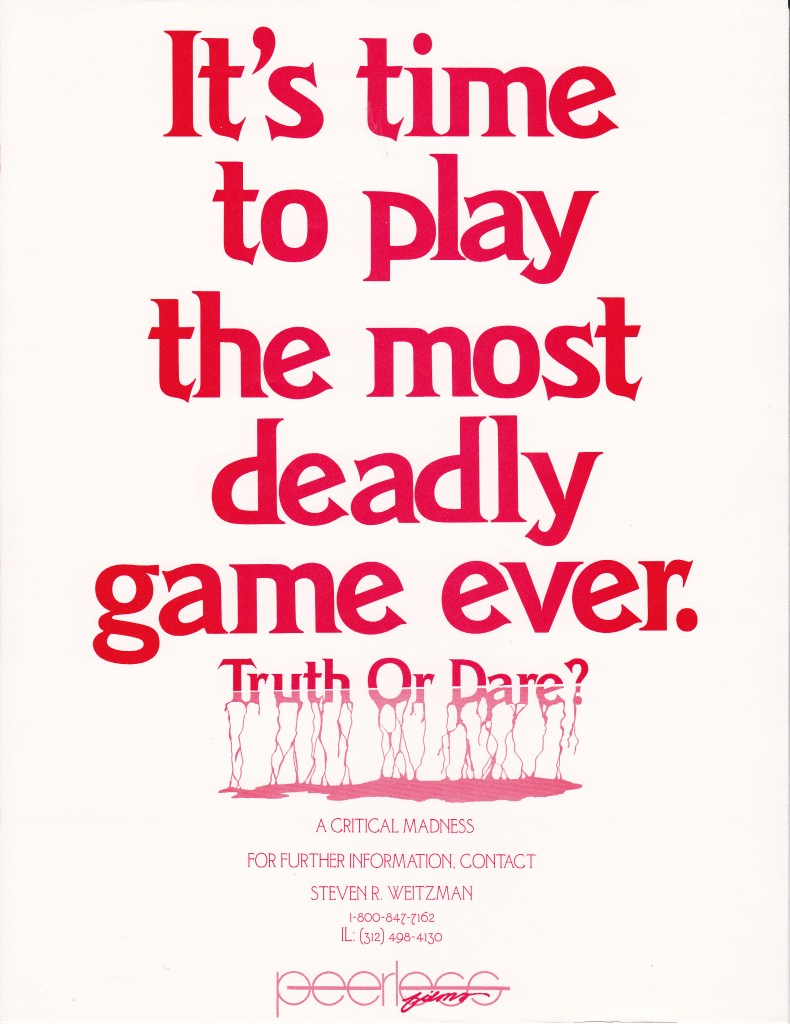 A brainchild of Tim Ritter, Truth or Dare? (also known as Truth or Dare?: A Critical Madness) began in 1985 as a short film in an anthology called Twisted Illusions. At the time, Tim was still in high school, but he had already made Day of the Reaper (shot on Super 8mm film) the year prior. Along with his collaborator, Joel Wynkoop, Tim was inspired by Blood Cult, which had used a direct-to-video model for distribution. They took a unique approach to getting their films into video stores, driving across Florida— from Miami to Dayton—selling films directly to stores, and using “van guys” (who distributed used studio films and adult films) to expand their reach.