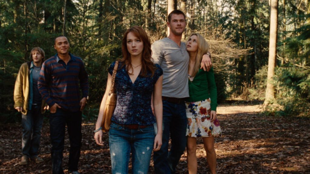 The Cabin in the Woods presents itself as a familiar slasher film. Five college friends: athletic Curt (Chris Hemsworth), bookish Holden (Jesse Williams), stoner Marty (Fran Kranz), flirtatious Jules (Anna Hutchison), and reserved Dana (Kristen Connolly), embark on a weekend trip to a secluded cabin in the woods. While partying, they discover a mysterious basement filled with strange artifacts and unknowingly activate an ancient curse by reading from an old diary, summoning the zombified Buckner family who rise from the grave to hunt them down. Up until this point, the film appears to follow a very well-worn and trite horror formula, positioning itself as the standard teens in peril slasher, and yes, Randy Meeks’ Rules to Survive apply here.