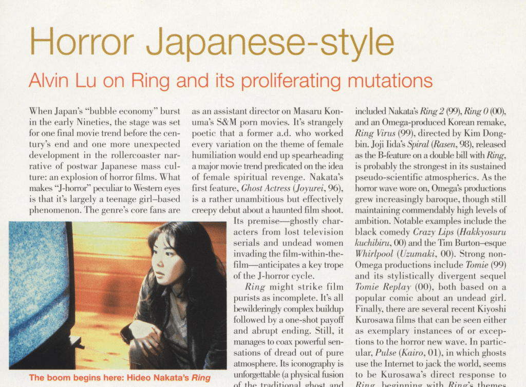 Such elasticity points toward another cinematic point of entry: critics and festivals tasked with framing this “new wave” of Japanese horror. Tom Mes, co-founder of Midnight Eye, traced the label’s first major usage to a January 2002 Film Comment feature by Alvin Lu. In conversation, Lu credited his editor Chuck Stephens for introducing the term into his work; Stephens, in turn, recalled borrowing the phrase for a 2001 PULP review of Uzumaki (of which Lu, circularly, was Editor-in-Chief) from the “fanboy shorthand” of cult zines like Asian Trash Cinema. None claimed ownership, but their deployment legitimized “J-Horror” in print at the same moment DreamWorks marketed it as already familiar.