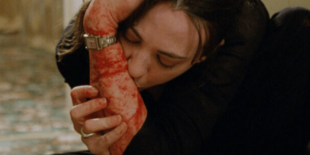 Dans Ma Peau (2002), written and directed by, and starring Marina de Van, follows Esther, a woman who appears, on the surface, to have it all. But after an incident at a party leads to an injury, she begins to probe the site, fixated on her (lack of) pain. As she transcends the limits of her flesh, she finds herself increasingly treated as an outsider. Her probing renders her abject as she violates normative social boundaries, evident in the disgust of those around her when glimpsing her scabbed and oozing flesh. From the start of the film, Esther is failing at capitalism. She is surrounded by pressures to transform into a good “monogamous heterosexual bourgeois patriarchal capitalist” subject (Wood, 2003), but finds the prospect unbearable. As a result, she is searching for subjectivity and identity as she is consumed by urges to mutilate. This urge can be seen as an externalization of bodily malaise and an expression of the stressors of productivity in a capitalist business setting (Palmer, 2007). She is held in the Western trap of body (object) and mind (subject), confronted by the disconnect between the mind and the body (Dooley, 2019). Through auto cannibalism, she seeks to reconnect to the body she is alienated from, to understand what it means to exist within a body in the capitalist, patriarchal world she resides in. According to Kristeva, to be a masochist is to abject the self, and Esther’s bodily breakdown presents a willing shift into abjection. Esther’s inability to control her body leads to her alienation, but rather than this being a source of pain, it is a relief, allowing her to turn her attention inward, to explore the limits of herself. Freed from the weight of other people’s expectations, she can turn to internal exploration, to understand herself and what gives her life meaning. In the final sequence, she moves into an intimate, captivating tenderness, carving into herself with reverence. As she laps at her blood and takes pictures of her broken flesh, it is clear that she has rejected the safe path of convention to take an ambiguous path, killing the life she has been forced into, to allow for her rebirth.