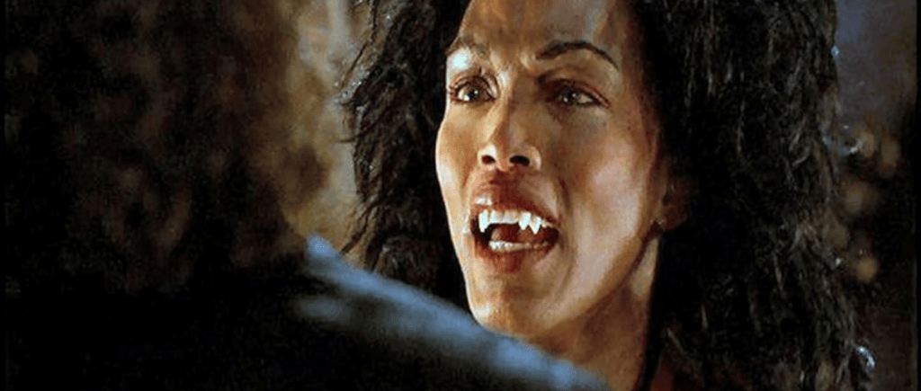 Rita Veder (Angela Bassett in Vampire in Brooklyn, 1995) doesn’t run from the monster. She lets him believe she needs him. Maximillian struts around like he’s the headline, but Rita’s the one actually changing. He’s all leather coat bravado, selling freedom while quietly tightening the leash. Rita doesn’t escape him; she outgrows him. What looks like seduction is really her clocking her own power again, the kind that never needed his permission. He thinks he’s giving her immortality. All he really does is remind her who she’s always been.