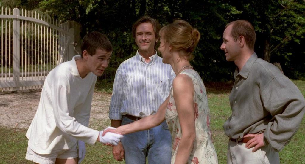 In both versions of Funny Games, the violence starts long before it’s physical. Two young men arrive at a holiday home asking to borrow eggs. They’re well spoken. They’re all in white, clean, calm. They apologize constantly. They smile.
